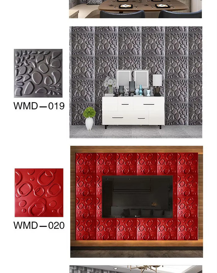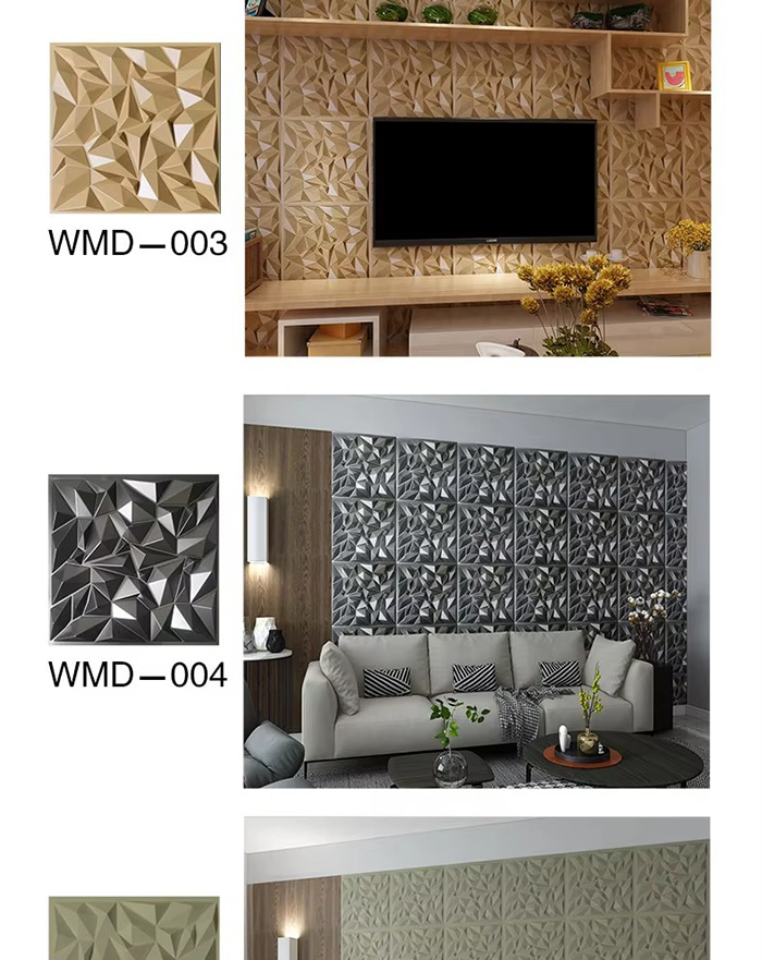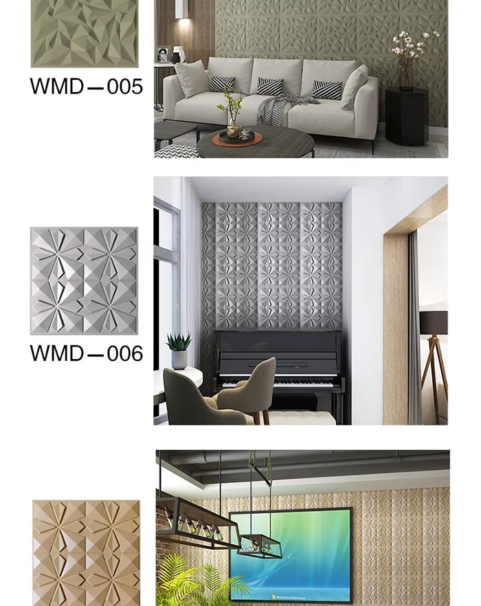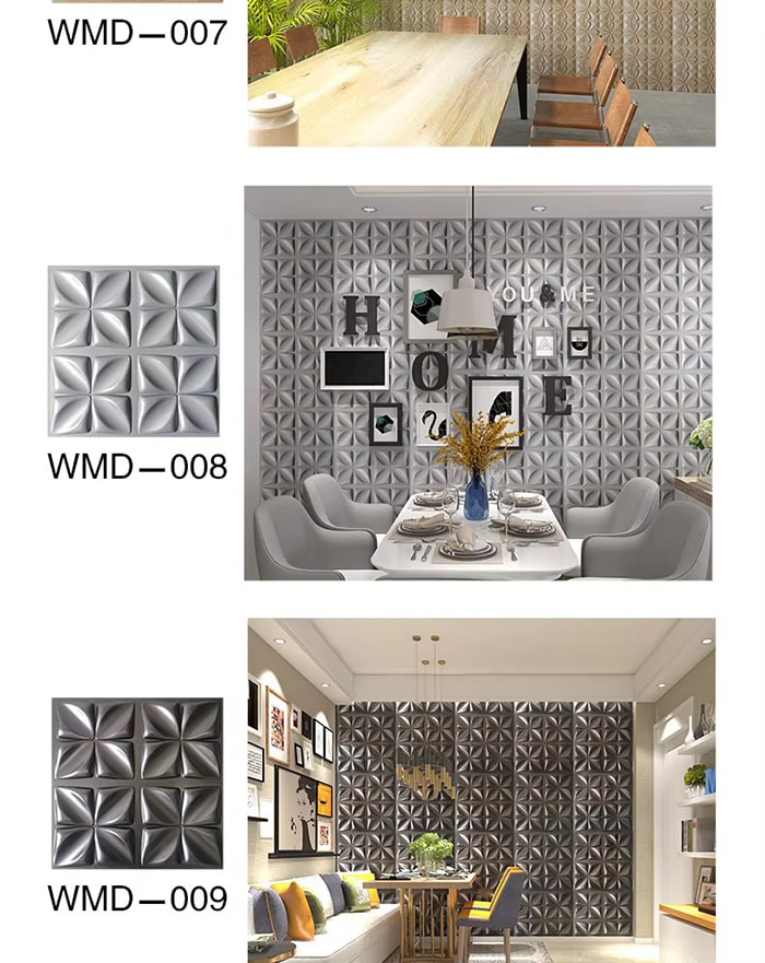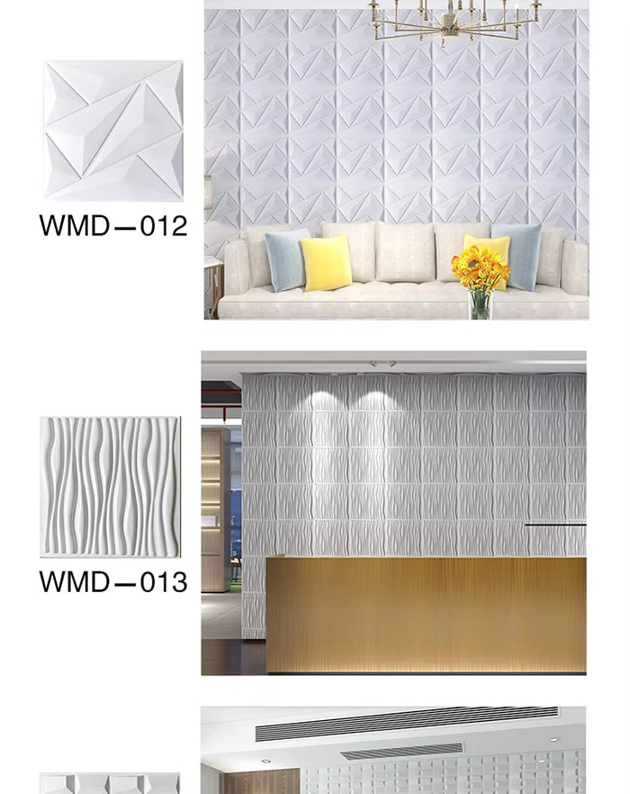 Panel dinding 3D ialah jenis bahan hiasan baharu. Melalui penekanan panas acuan, ukiran dan pengilangan atau percetakan CNC, corak tiga dimensi terbentuk pada permukaan panel. Bahan asasnya termasuk PVC, papan ketumpatan, aloi aluminium, gentian buluh, dll. Mengambil PVC sebagai contoh, bahan komposit molekul tinggi disemperit pada suhu tinggi, dan corak permukaan ditekan oleh acuan keluli ketepatan, dengan ketepatan cekung dan cembung minimum mencapai 0.1mm. Panel dinding 3D mempunyai kesan visual tiga dimensi. Melalui prinsip biasan cahaya dan bayang-bayang, satah 2D diubah menjadi kesan visual 3D dengan deria kedalaman, dan lapisan visual meningkat lebih daripada 3 kali di bawah kawasan yang sama.
