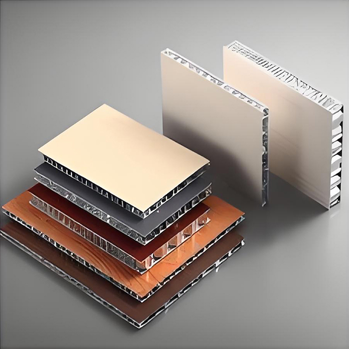 Panel dinding sarang lebah aluminium ialah struktur sandwic, yang terdiri daripada dua lapisan aluminium dan teras sarang lebah. Panel terutamanya diperbuat daripada plat aluminium aloi 3003H24 berkualiti tinggi atau plat aluminium aloi mangan tinggi 5052AH14 sebagai bahan asas, dengan ketebalan panel 0.8~1.5mm dan ketebalan plat bawah 0.6~1.0mm. Teras sarang lebah diperbuat daripada kerajang aluminium 3003 yang sangat nipis dengan ketebalan 0.04~0.06mm dan panjang sisi 5~6mm. Ia mempunyai struktur lubang sarang lebah heksagon dengan lubang bersambung antara satu sama lain. Keseluruhan proses pemprosesan selesai di kilang moden menggunakan teknologi hot pressing.