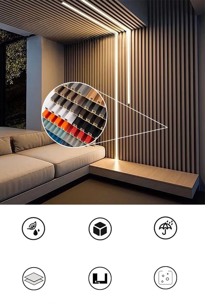 Panel dalaman WPC ialah panel hiasan mesra alam baharu yang diperbuat daripada gentian kayu atau gentian buluh sebagai bahan mentah teras, dikompaun dengan resin PVC, serbuk kalsium karbonat dan penstabil melalui proses suhu tinggi dan tekanan tinggi. Permukaan menggunakan salutan UV atau teknologi pemindahan ketepatan tinggi untuk mensimulasikan tekstur kayu dan batu semula jadi, dan mempunyai ciri-ciri kalis air dan kalis lembapan, kalis cendawan dan antibakteria, ringan dan kekuatan tinggi. Ia sesuai untuk dinding dalaman, siling, dinding latar belakang dan pemandangan lain, dan merupakan pilihan ideal untuk menggantikan venir kayu tradisional dan gusset plastik.