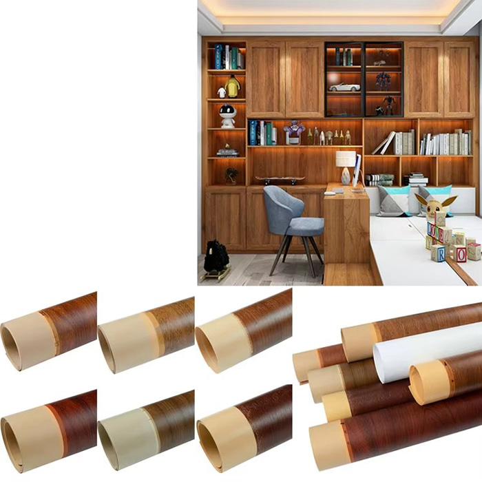 Perabot panel : Tiruan bijirin kayu dan venir bijirin batu (seperti kayu oak, walnut, tekstur marmar) untuk meningkatkan nilai tambah produk.